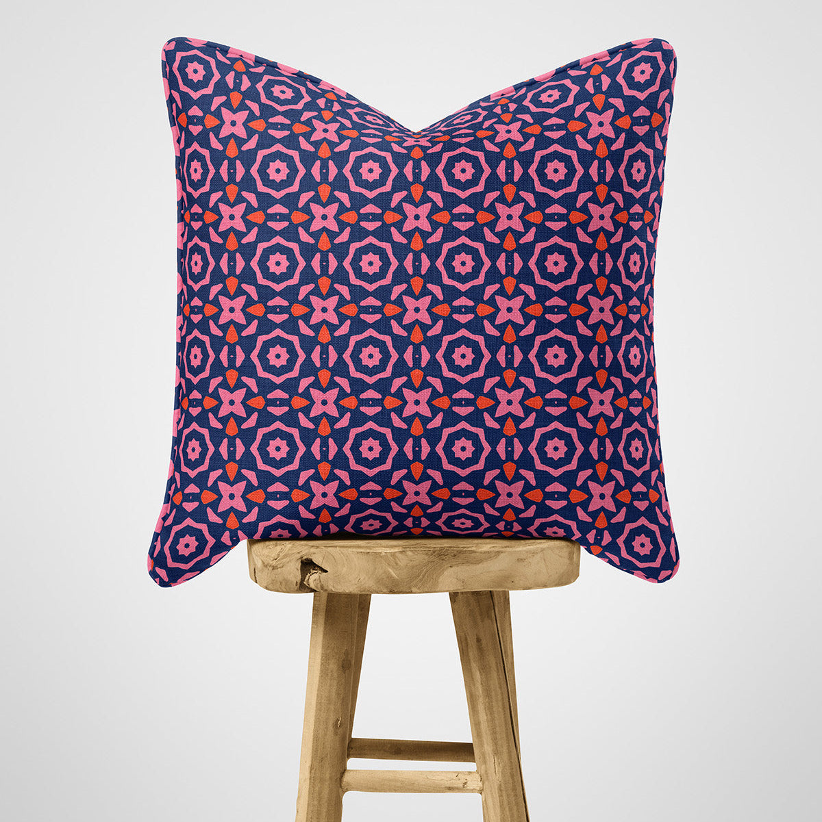 Cotton cushion with a pink red and blue geometric pattern on a wooden stool against a light grey background