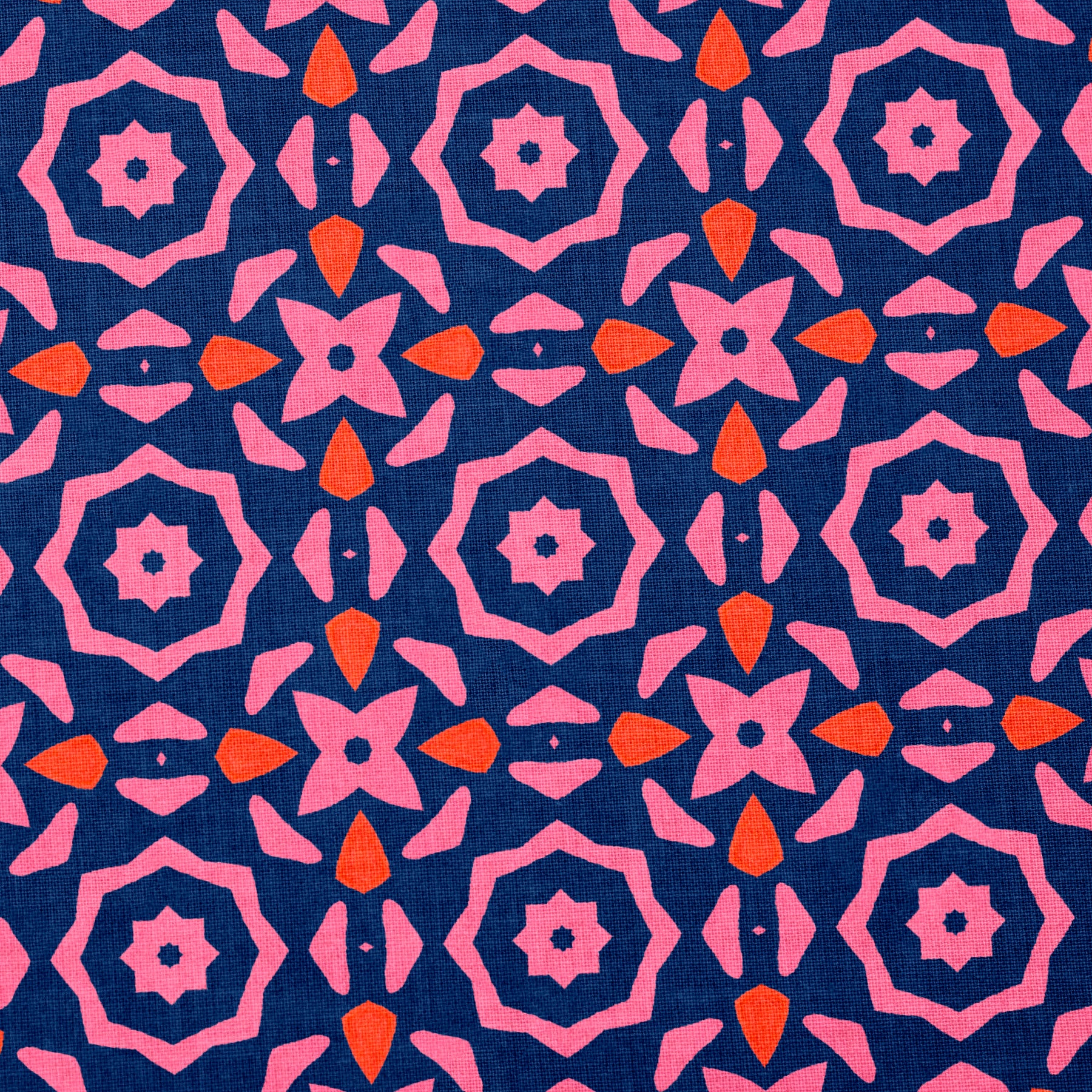 Featuring a hand painted mosaic style pattern in vibrant pinks and pops of orange set against a deep blue background, this fabric feels confident, modern and full of personality.